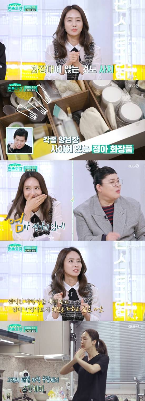 박정아는 고양이 세수를 하고 주방 서랍에서 화장수를 꺼내 사용하는 모습으로 모두를 놀라게 했다. 화장대에 앉을 시간이 없어 각종 양념장 사이에 화장품을 넣어 놓은 것이다. 이영자는 "우리가 알던 정아는 어디 가고 엄마 정아만 있다"고 감탄했다.