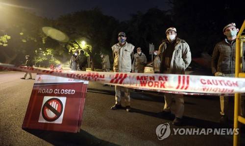 epa08973051 Indian police personnel stand guard after a blast near the Israeli embassy in New Delhi, India, 29 January 2021. According to the news reports, a low intensity blast near the Israeli embassy damaged cars at the site as police reached on spot for further investigations. EPA/RAJAT GUPTA