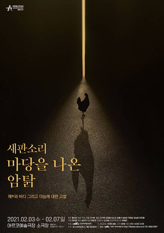 29일 한국문화예술위원회에 따르면 국내 창작동화 최초로 밀리언셀러를 기록하고 프랑스, 그리스, 중국, 일본 등 세계 29개국에 번역·출판 된 황선미 원작 ‘마당을 나온 암탉’은 소리꾼이자 연출가인 지기학 창본·작창·연출의 ‘새판소리’로 만들어져 2월 3일부터 7일까지 서울 대학로 아르코예술극장 소극장 무대에 오른다.