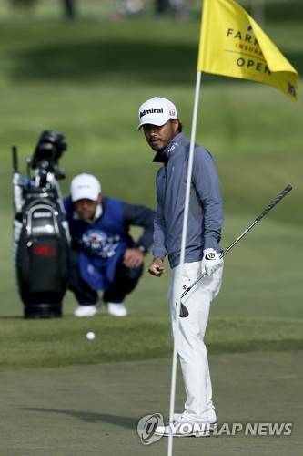 epa08973775 Satoshi Kodaira of Japan surveys the fifth green before hitting a chip shot during the second round of the Farmers Insurance Open at Torrey Pines Golf Course in San Diego, California, USA, 29 January 2021. EPA/ETIENNE LAURENT