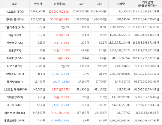 가상화폐 시세 (제공: 암호화폐 거래소 업비트)현재 암호화폐 거래소 "업비트"에 따르면 가상화폐 대장 격인 비트코인의 시세는 전일 대비 875,000원(2.39%) 상승한 37,499,000원에 거래되고 있다.