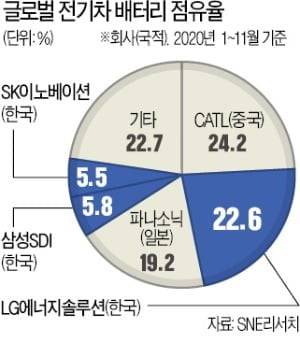 SK이노베이션은 최 회장의 전폭적인 지지를 업고 전기차 배터리 시장에서 급성장하고 있다. 시장조사업체 SNE리서치에 따르면 지난해 1~11월 전 세계에 판매된 전기차 탑재 배터리 사용량 순위에서 SK는 점유율 5.5%로 세계 5위를 차지했다. 전년 같은 기간 9위에서 4계단 뛰어올랐다. 전세계 배터리 업체 중 가장 높은 성장세를 기록했다.