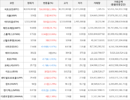 가상화폐 시세 (제공: 암호화폐 거래소 업비트)현재 암호화폐 거래소 "업비트"에 따르면 가상화폐 대장 격인 비트코인의 시세는 전일 대비 516,000원(1.38%) 상승한 38,039,000원에 거래되고 있다.