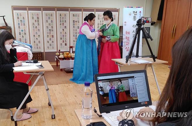 (대전=연합뉴스) 조성민 기자 = 대전평생학습관 예절교육센터가 30일 설을 앞두고 미리 신청한 학생 가정이 온라인으로 참가한 가운데 전통 세시풍속 체험교실을 열어 한복 옷고름 매는 법을 시연하고 있다. 2021.1.30
