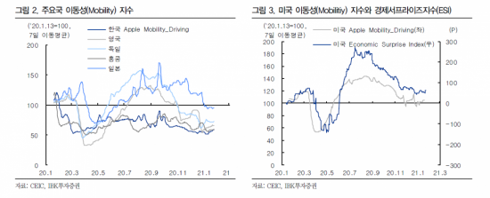 때문에 다음달 초 발표될 국내외 경제지표에 더욱 촉각을 곤두세워야 한다는 지적이 나온다. 지난해 연말 선진국에서 백신 접종이 시작된 이후 소비와 투자 등 투자자들의 감정적인 기대감을 나타내는 지표(센티멘트) 일부가 개선됐지, 변종 바이러스 확산과 코로나19 백신 공급 차질로 그 흐름이 약해질 수 있다는 전망이다. 안 연구원은 "유럽과 아시아 일부 지역의 봉쇄조치가 강화 및 연장되면서 이동성(Mobility) 지수가 위축돼 있는 상황"이라며 "코로나19 사태 이후 사회적 거리두기 및 봉쇄조치 강도에 따라 경제지표가 등락해왔는데, 이는 증시에도 부담으로 작용할 수 있다"고 분석했다.