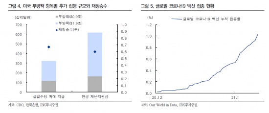 경기 회복에 대한 기대도 여전하다. 지난해 말 미국에서 통과된 9000억달러 규모 부양책은 현재 진행 중이다. 조 바이든 정부의 1조9000억달러 규모 부양책도 추진되고 있다. 의회에서 부양책 규모가 축소되더라도 미국 내수 경기에 미칠 상방 압력은 유효하다는 분석이다. 부양책에 담긴 추가 실업수당과 재난지원금 지급이 비교적 높은 경기 부양 효과를 보이고 있기 때문이다. 지금 시행 중인 추가 실업수당 지급 조치가 오는 3월 종료되는 만큼 다음달 중에는 새 부양책이 통과될 것으로 점쳐진다.