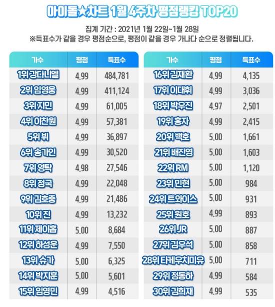 최근 아이돌차트 측은 지난 28일까지 집계된 아이돌차트 1월 4주차 평점랭킹을 공개했다.