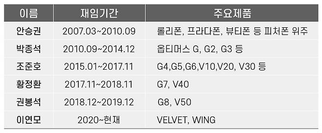 2007년부터 지금까지 MC사업본부 경영진 계보는 '안승권-박종석-조준호-황정환-권봉석-이연모'로 이어진다.