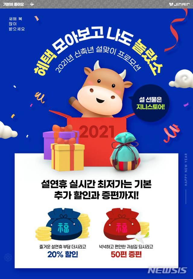 [서울=뉴시스] 최희정 기자 = 진에어가 설 연휴를 앞두고 국내선 증편을 실시하고 7일 간 이벤트를 진행한다고 밝혔다.