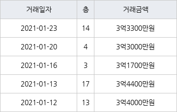 국토교통부 실거래가 공개시스템에 따르면 지난 2021년 1월 20일 인천광역시 연수구 연수동 연수우성2차 4층 전용면적 59㎡형이 3억3000만원에 거래됐다. 지난 2021년 1월 23일 같은 면적형인 14층 물건이 3억3300만원에 실거래된 것과 비교해 300만원 낮은 가격이다.
