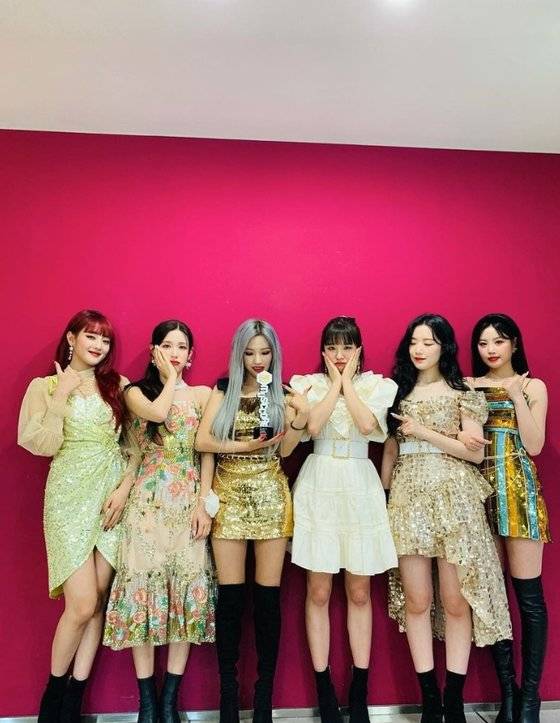 공개된 사진엔 '쇼! 음악중심' 1위 트로피와 함께 나란히 선 민니, 미연, 소연, 우기, 슈화, 수진의 모습이 담겼다. 반짝이는 무대 의상으로 스타일링한 여섯 멤버의 화려한 비주얼이 시선을 사로잡는다.