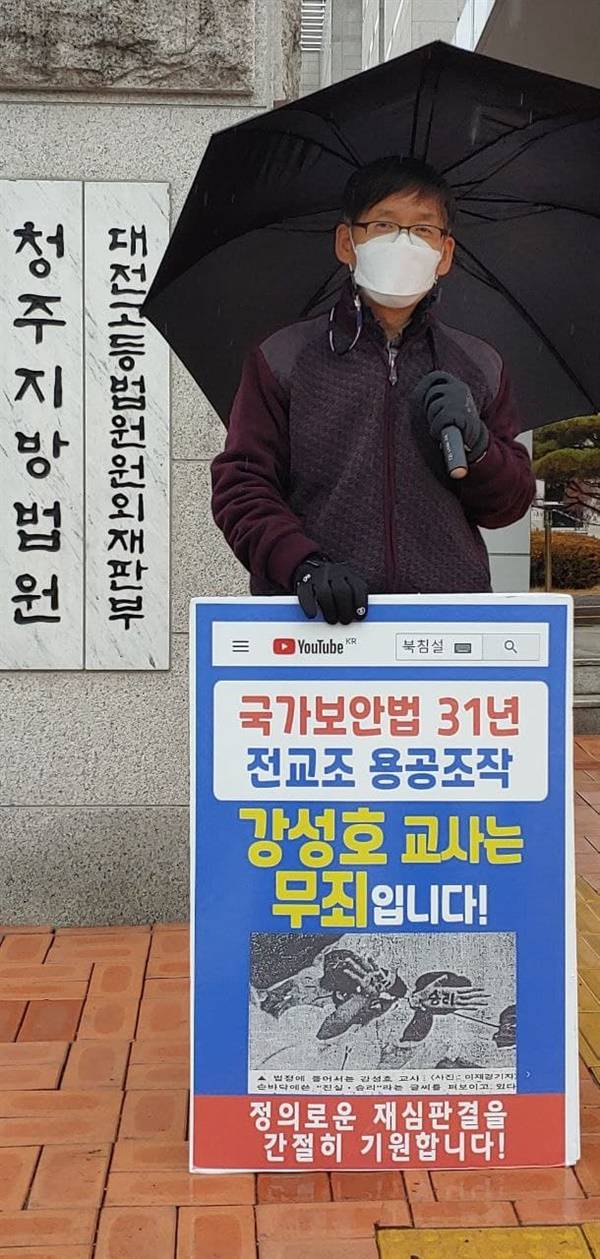 | ▲ 강성호교사는 지난해 12월 1일부터 매주 화요일 11시 반 청주지방법원앞에서 1인 시위를 이어가고 있다. |