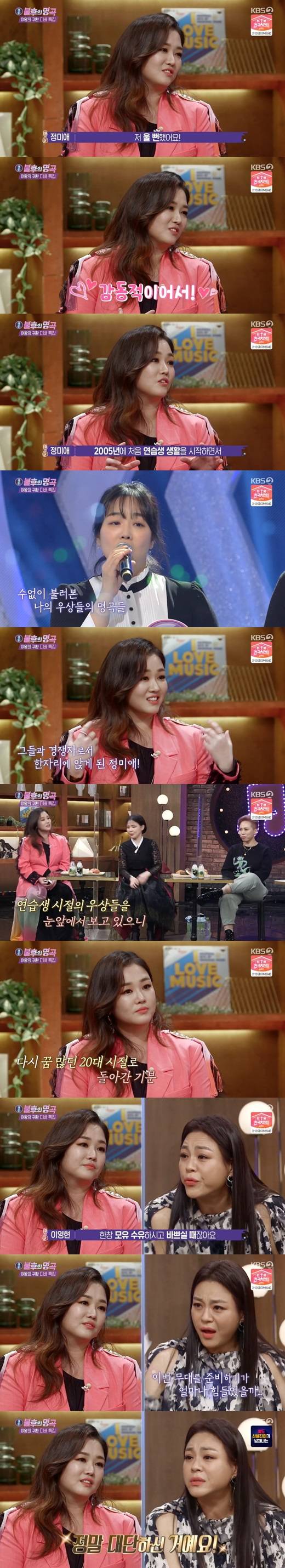 이날 정미애는 "여기에 앉자마자 울 뻔했다. 너무 감동적이었다. 제가 2005년에 처음 연습생 생활을 시작하면서 가장 많이 들으면서 연습했던 노래의 아티스트들이 여기 다 앉아계셨다. 제가 이분들과 같이 앉아 있을 줄 몰랐다"고 말하며 울컥했다.