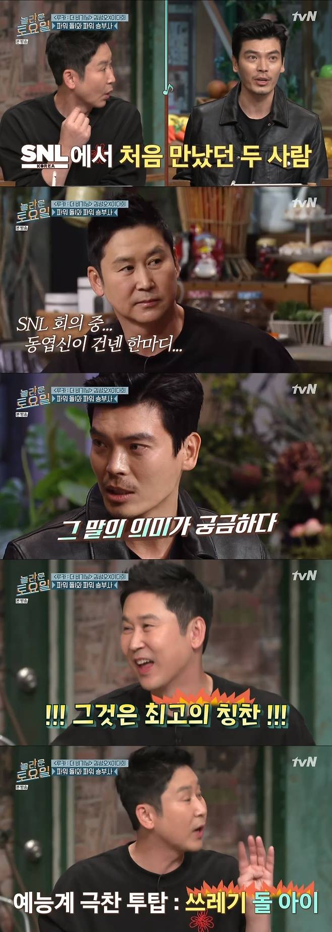 신동엽은 "최고의 칭찬이다. 내가 그렇게까지 칭찬을 했냐. 김성오가 현장에서 아이디어 내는데 너무 말도 안 되는 신박한 아이디어를 내더라. 우리에겐 쓰레기, 돌 아이가 최고의 칭찬이다"고 해명했다.(사진=tvN '놀라운 토요일' 캡처)
