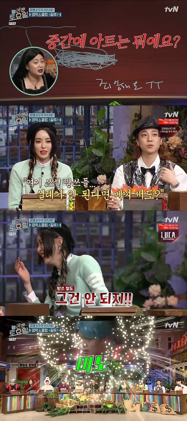 첫 번째 문제는 영턱스클럽 '질투'였다. 이다희는 노래를 안다고 했지만 '죄송해요'를 쓰며 모두를 깜짝 놀라게 했다. 이다희는 "다른 사람이 쓴 거 보고 보고 쓰려고 했다"고 전했다.