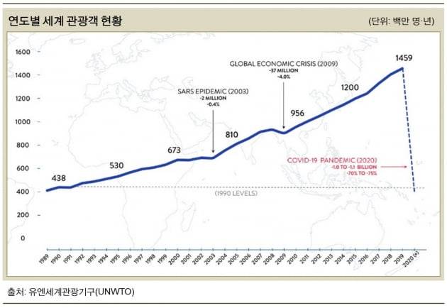 지난해 신종 코로나바이러스 감염증(코로나19) 팬데믹 사태로 전 세계 관광객 수가 30년 전인 1990년 수준으로 급감한 것으로 나타났다. 유엔세계관광기구(UNWTO)는 지난 27일 "코로나19 대유행으로 2020년 한 해에만 10억 명이 넘는 국제 관광객이 줄었다"고 밝혔다. 2019년 15억 명에 육박하던 세계 관광시장이 1년 새 4억 명 안팎으로 쪼그라들었다는 설명이다. UNWTO는 "2020년은 세계 관광업계에게 역사상 '최악(worst)의 해'"라고 평가했다.