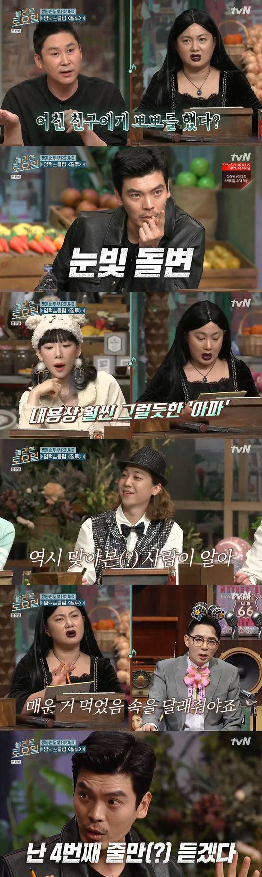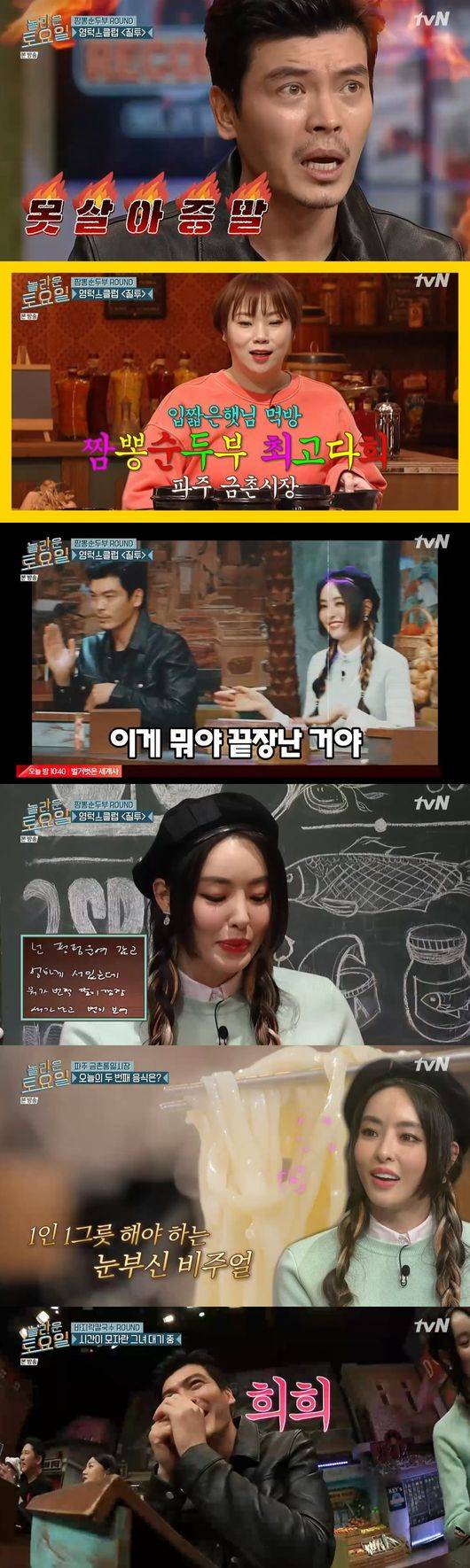'놀토' 멤버들과 이다희, 김성오는 초성힌트로 정확하게 답을 유추해 영턱스클럽 '질투' 가사 받아쓰기에 성공해 짬뽕 순두부를 즐겼다.