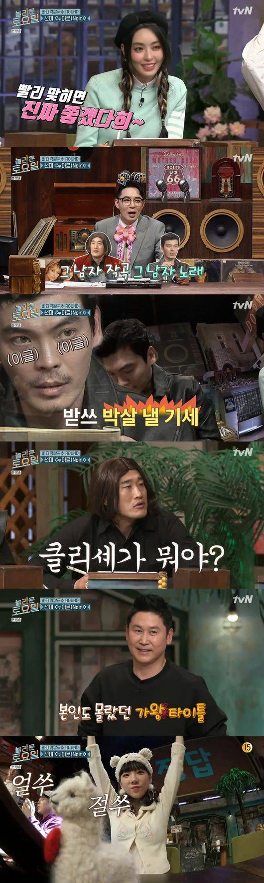 한편, 다음으로 이어진 문제는 선미의 '누아르'였다. MC붐은 영어가 아닌 외국어 단어가 들어간다고 힌트를 던졌고 이에 한해는 '클리셰'라는 단어를 언급했다. 결국 '놀토' 멤버들과 이다희, 김성오는 70% 느리게 듣기 힌트를 이용해 정답에 성공해 바지락 칼국수를 맛봤다.