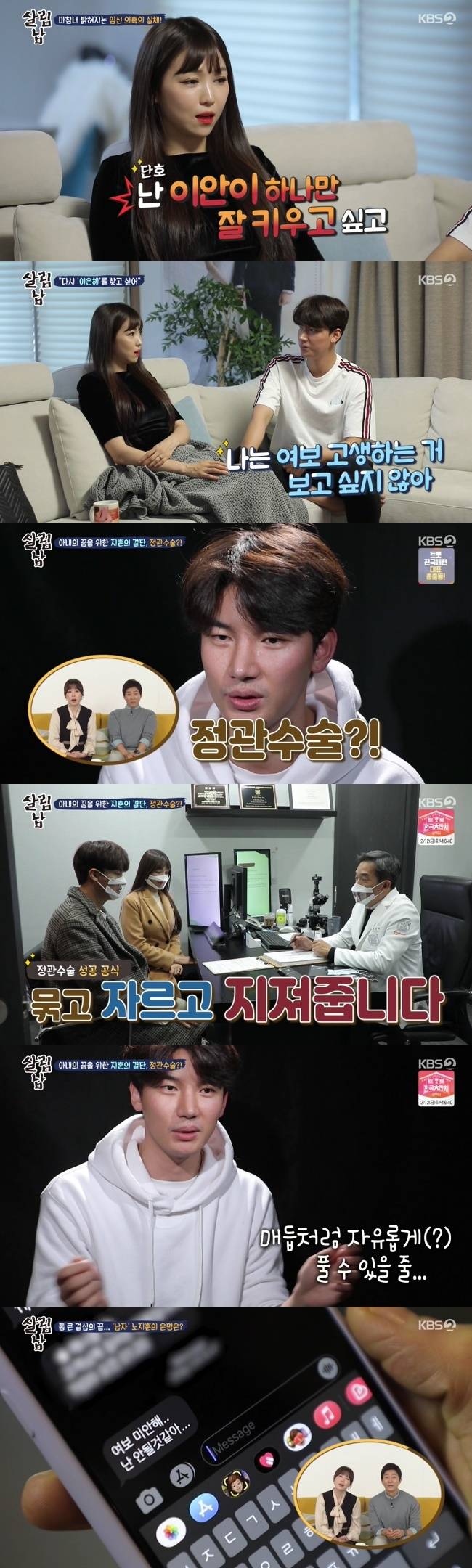 의사는 수술 과정에 대해 자세하게 설명했다. 노지훈은 “그냥 묶는 거라고 생각해 자유로울 줄 알았다”고 당황했다. 이후 노지훈은 “여보 미안해. 난 안될 것 같아”라는 문자를 남긴 채 도망갔다. (사진=KBS 2TV '살림하는 남자들 시즌2' 방송 캡처)