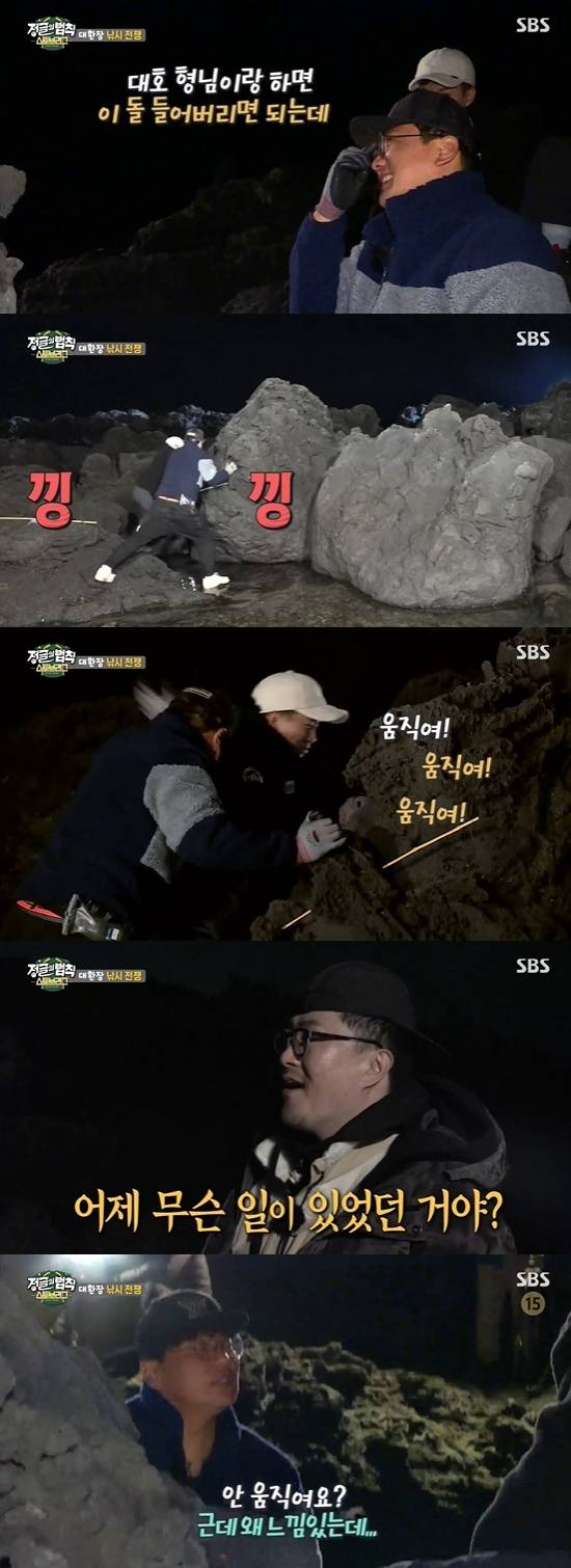 이어 나태주는 바위를 들어 올리면 더 잘 잡을 수 있을 것 같다고 말했다. 데프콘은 "다음 생에 태어나서 할 수 있다"라고 했고, 이초희도 돌이 크다고 만류했다. 하지만 나태주는 "이거 하면 사나이 등극"이라며 김태균과 함께 바위를 밀었다. 두 사람은 "안 움직였냐. 움직인 느낌인데"라며 계속 돌을 밀고 당겼다. 데프콘은 "어떻게 저런 돌을 움직일 수 있다고 생각하지? 운동을 너무 해도 안 좋은 거야"라고 말했고, 이초희는 "미쳤나봐. 나중에 TV로 꼭 봐라"라고 말해 웃음을 자아냈다.