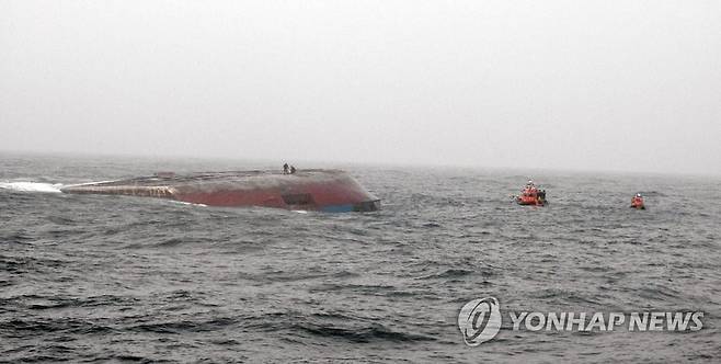 (군산=연합뉴스) 30일 오후 4시께 전북 군산시 옥도면 십이동파도 남서쪽 9.6㎞ 해상에서 2천604t급 바지선(화물 운반선)이 전복돼 해경이 수색작업을 하고 있다. 2021.1.31 [군산해양경찰서 제공. 재판매 및 DB금지]