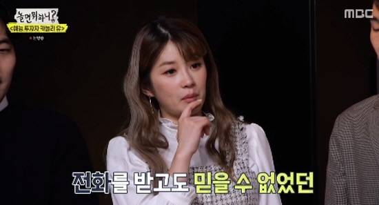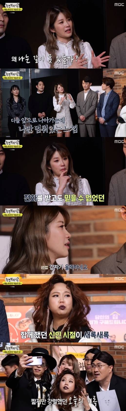 말미에는 끝내 눈물을 흘렸다. "왜 나는 같이 못 있을까, 저 자리에 못 갈까 싶었다. '놀면 뭐하니?'에서 전화왔을 때 거짓말인 줄 알았다. 갑자기 울컥한다"라고 고백했다.
