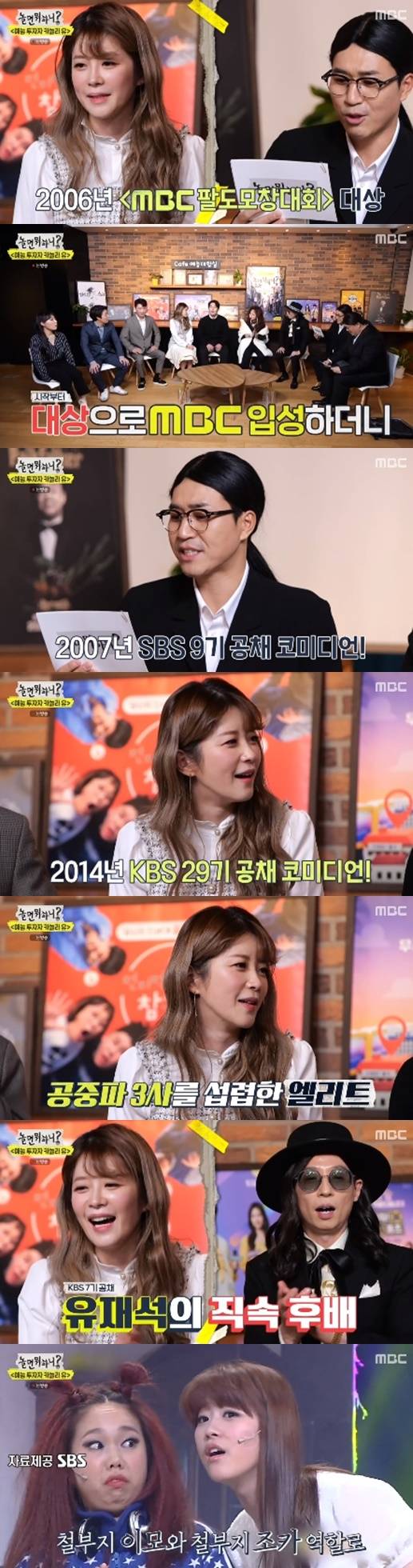 김승혜는 김숙, 유민상 등의 추천을 받고 출연했다. 2006년 MBC 팔도모창대회에서 대상을 받고 2007년 SBS 9기 공채 코미디언, 2014년 KBS 29기 공채 코미디언까지 방송 3사를 섭렵한 인재다. 이날 그는 인싸댄스, 환불원정대 댄스, 코끼리 개인기 등 열정을 폭발했다.
