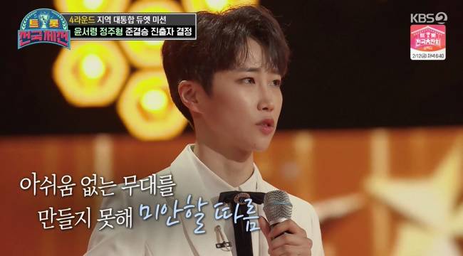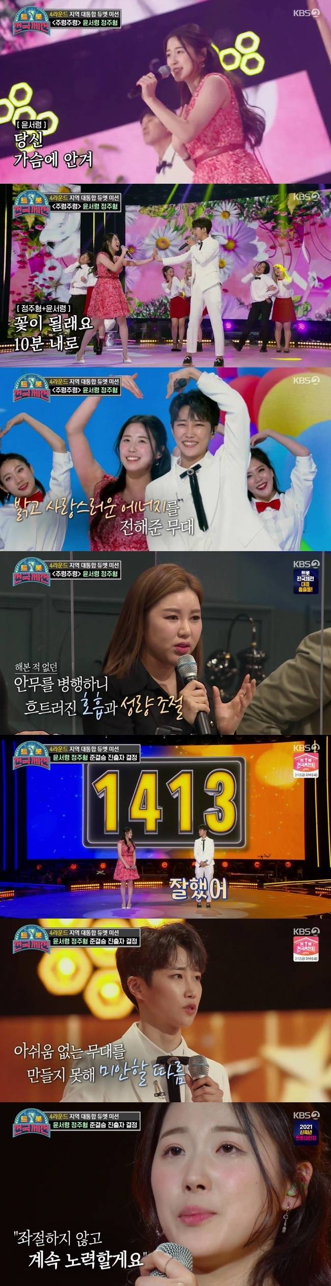 윤서령도 “올라오면서 많은 걸 배웠다. 제 인생에서 큰 무대였고, 여기서 좌절하지 않고 새로운 윤서령을 보여드리려고 노력하겠다. 주형 언니 그동안 감사했다”고 눈물을 흘렸다. (사진=KBS 2TV '트롯전국체전' 방송 캡처)