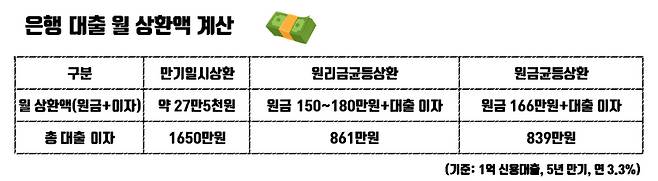 1억 원 신용대출(5년 만기, 연 3.3%)에 대한 총 이자를 계산해보면 만기일시상환(1650만 원), 원리금균등분할(861만3898원), 원금균등분할(838만7500원)으로 차이가 벌어지기 때문입니다.