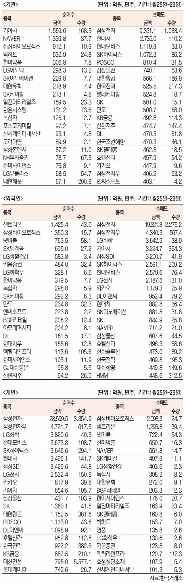 [표]주간 유가증권 기관·외국인·개인 순매수·도 상위종목(1월 25~29일)
