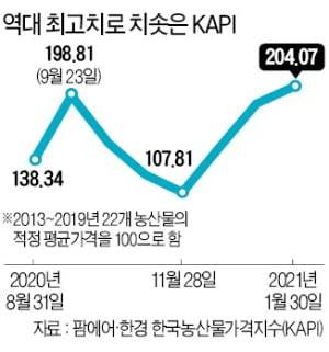 지난 30일 ‘팜에어·한경 한국농산물가격지수(KAPI: Korea Agricultural product Price Index)는 전주(173.66)보다 17.5% 오른 204.07로 사상 최고치를 경신했다. KAPI가 200을 돌파한 것은 관측을 시작한 2013년 1월 이후 처음이다. KAPI는 농산물 가격 분석·예측 기업 팜에어가 작성하고 한국경제신문이 발표하는 빅데이터·인공지능(AI) 기반 농산물 가격지수다. 국내 농산물 도소매시장에서 거래량과 대금 기준 상위 22개 품목의 거래 가격을 ㎏ 단위로 표준화한 뒤 산출한다.