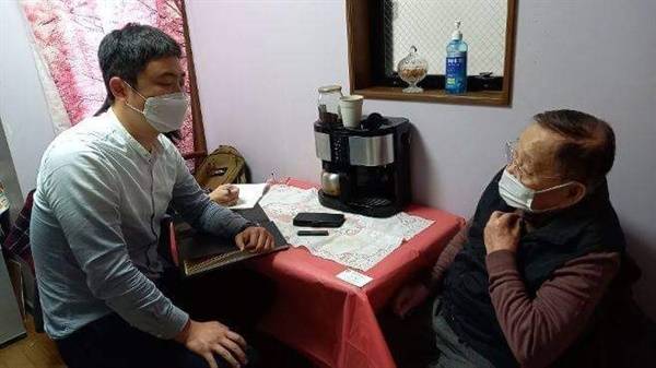 | ▲ 도쿄 자택에서 인터뷰에 응하고 있는 기시 우이치씨(96) 기시 씨(우측)가 본인의 전쟁 체험에 대해 술회하고 있다. |