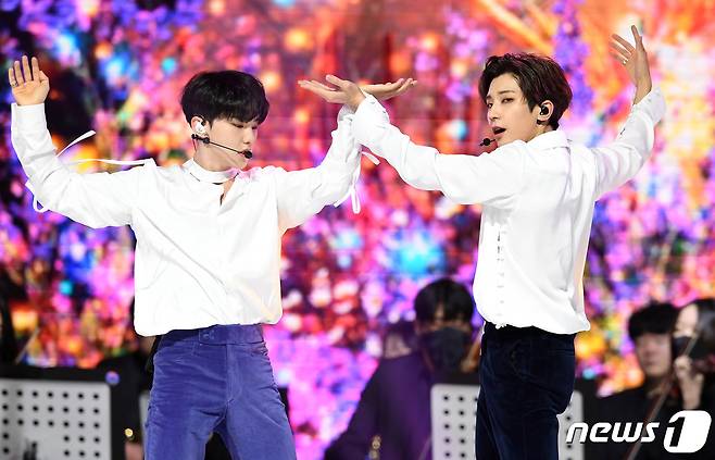 (서울=뉴스1) = 세븐틴의 호시(왼쪽)와 원우가 31일 서울 송파구 올림픽공원 체조경기장에서 열린 제30회 하이원 서울가요대상에 참석해 화려한 공연을 선보이고 있다. (스포츠서울 제공) 2021.1.31/뉴스1