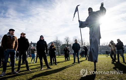 epa08977627 Protesters on the Museumplein at Museumplein, Amsterdam, Netherlands, 31 January 2021. According to media reports, Museumplein, is once again, classified as a 'security risk area', giving police officers the right to check and search anybody in that area without a cause. The police are extra vigilant about demonstrations and riots on Museumplein, after things got out of hand a week earlier. EPA/ANP09