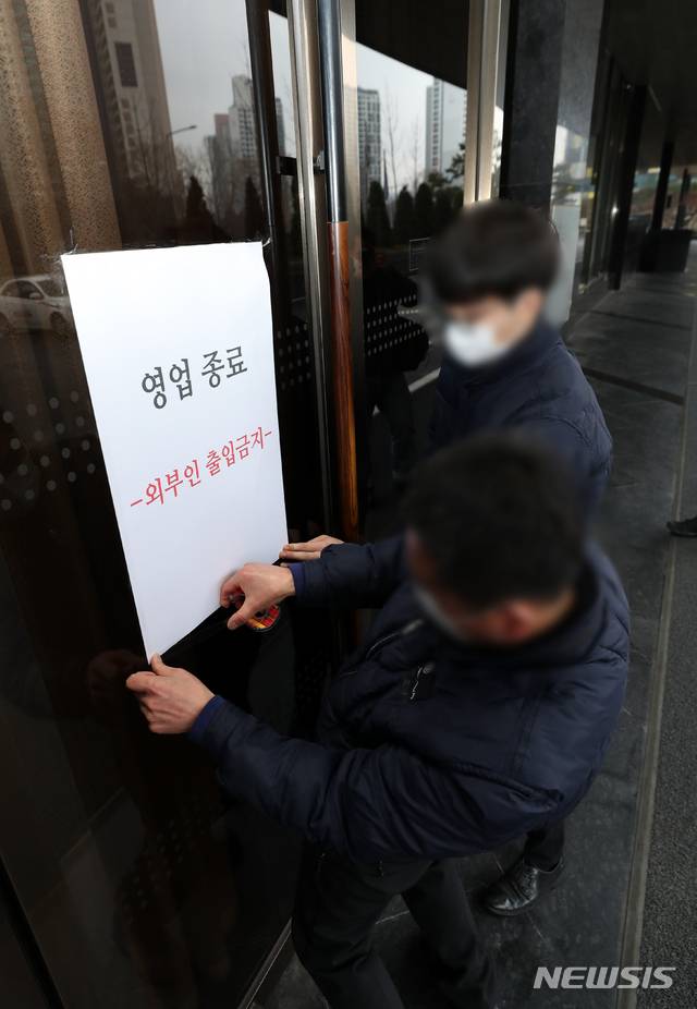 [서울=뉴시스]이윤청 기자 = 신종 코로나바이러스 감염증(코로나19) 장기화로 호텔 등 숙박업 경영난이 지속하고 있는 1일 서울 서초구 쉐라톤 서울 팔래스 강남호텔에서 관계자들이 영업종료 안내문을 붙이고 있다. 2021.02.01. radiohead@newsis.com