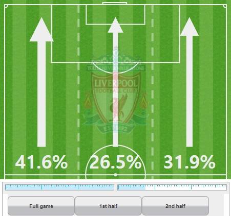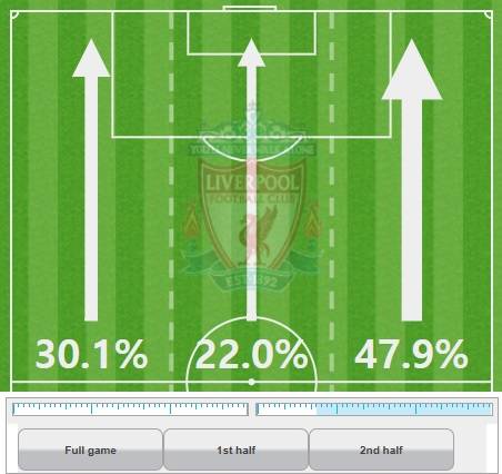 자연스럽게 리버풀의 공격은 57분(후반 12분)을 기점으로 오른쪽 측면 공격 위주로 이루어졌다. 실제 리버풀의 57분 이후 오른쪽 측면 공격 비율은 전체 공격의 절반에 가까운 무려 47.9%에 달했다. 반면 왼쪽 측면 공격 비율은 30.1%로 떨어졌다.