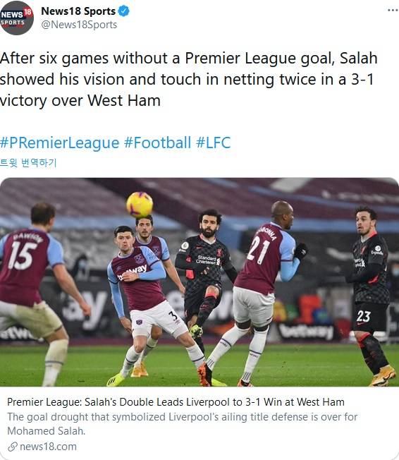 리버풀이 런던 스타디움 원정에서 열린 웨스트 햄과의 2020/21 시즌 프리미어 리그(이하 PL) 21라운드에서 후반전에 골을 몰아넣으며 3-1로 승리했다. 리버풀은 15라운드부터 20라운드까지 5경기 연속 무승(3무 2패)의 슬럼프에 빠졌으나 토트넘에 이어 웨스트 햄에게도 3-1 완승을 거두며 3위로 순위를 끌어올리는 데 성공했다.