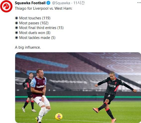 여기엔 티아고의 지원이 뒷받침 됐다고 봐도 무방하다. 물론 티아고가 골에 관여한 부분은 없었다. 하지만 티아고는 이 경기에서 리버풀 선수들 중 가장 많은 볼 터치(119회)와 가장 많은 패스(102회)는 물론 가장 많은 공격 진영 진입(15회)을 기록하며 경기 전반에 걸쳐 높은 영향력을 행사했다. 그의 위치에 따라 리버풀의 기본 공격 방향이 설정되는 모습이었다.