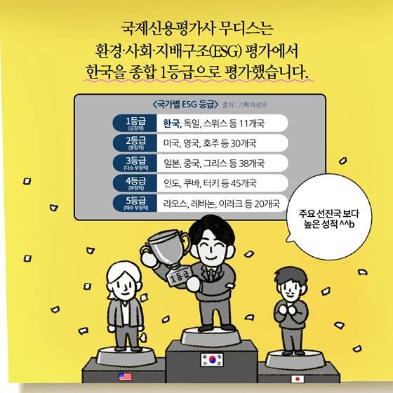 국제신용평가사 무디스는 환경·사회·지배구조(ESG) 평가에서 한국을 종합 1등급으로 평가했습니다.