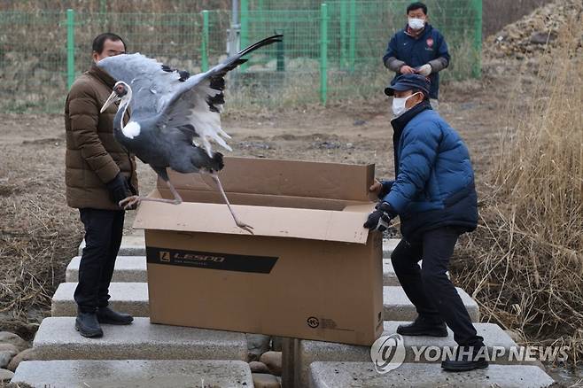(김포=연합뉴스) 한국야생조류보호협회는 부상한 천연기념물 제203호인 재두루미를 김포한강야생조류생태공원에 방사했다고 1일 밝혔다. 이 재두루미는 오른쪽 날개를 다쳤다가 치료를 받은 것으로 전해졌다. 2021.2.1 [한국야생조류보호협회 제공. 재판매 및 DB 금지]