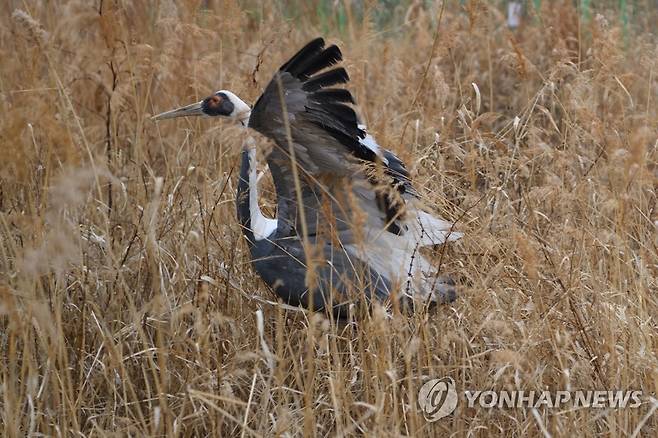(김포=연합뉴스) 한국야생조류보호협회는 부상한 천연기념물 제203호인 재두루미를 김포한강야생조류생태공원에 방사했다고 1일 밝혔다. 이 재두루미는 오른쪽 날개를 다쳤다가 치료를 받은 것으로 전해졌다. 2021.2.1 [한국야생조류보호협회 제공. 재판매 및 DB 금지]