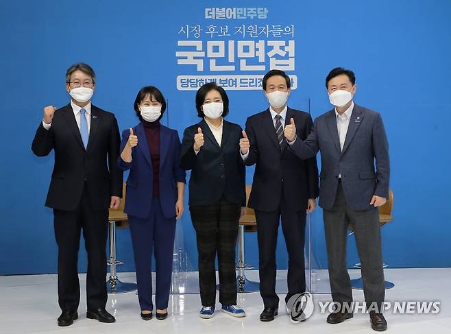 (서울=연합뉴스) 더불어민주당 부산시장 후보 경선에 출마한 변성완 전 부산시장 권한대행(왼쪽부터), 박인영 전 부산시의회 의장, 서울시장 후보 경선에 출마한 박영선 전 중소벤처기업부 장관, 우상호 의원, 부산시장 후보 경선에 출마한 김영춘 전 해양수산부 장관이 1일 서울 금천구 한 스튜디오에서 열린 '더불어민주당 시장 후보 지원자들의 국민면접' 방송촬영에 앞서 함께 기념촬영을 하고 있다. 2021.2.1 [국회사진기자단]