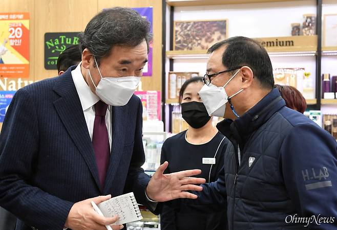 | ▲ 더불어민주당 이낙연 대표가 14일 코로나19 이익공유제 실현 현장 방문의 일환으로 서울 영등포 지하상가 내 네이처컬렉션을 찾아 정기화 가맹점주의 얘기를 듣고 있다. |