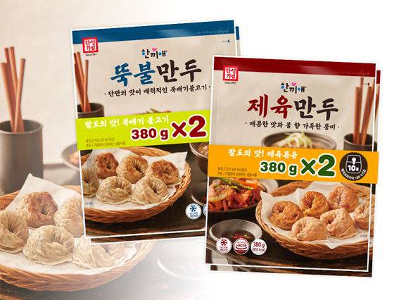 대한민국 대표 인기 메뉴인 제육볶음과 뚝배기불고기를 만두에 담아 만들었으며 2종 모두 국내산 돼지고기 30% 이상을 사용하고 신선한 재료와 특제 양념을 사용하여 맛깔스러움과 품질 모두를 잡았다.