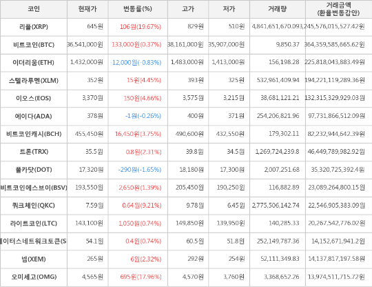 [표]가상화폐 시세 (제공: 암호화폐 거래소 업비트)
