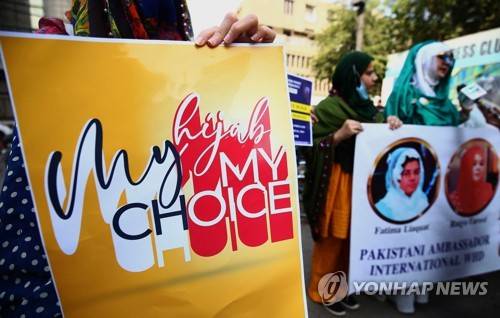 epa08979886 Pakistani women hold placards to mark the World Hijab (Veil) Day in Karachi, Pakistan, 01 February 2020. International Hijab Day was observed to show solidarity with Muslim women in countries where laws ban full-face veils. EPA/SHAHZAIB AKBER