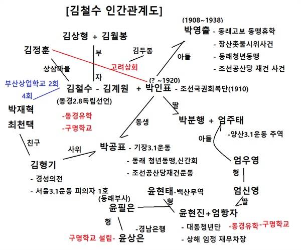 | ▲ 김철수 인간관계도 김철수는 양산 출신으로 기장의 자형 박인표 등 혼맥과 지역 관계로 서로 연결되어있었다. |