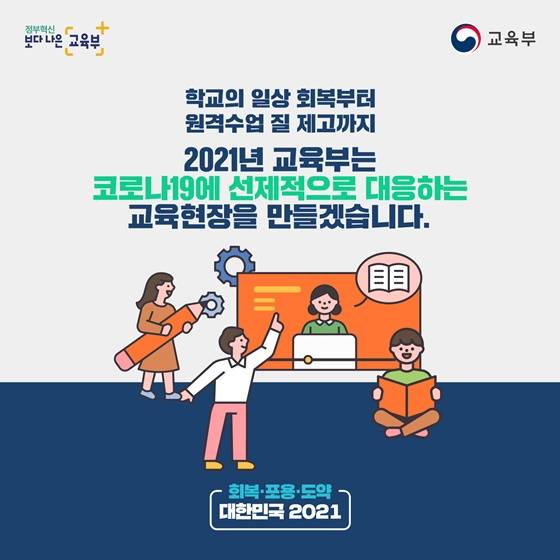 학교의 일상 회복부터 원격수업 질 제고까지 2021년 교육부는 코로나19에 선제적으로 대응하는 교육현장을 만들겠습니다.