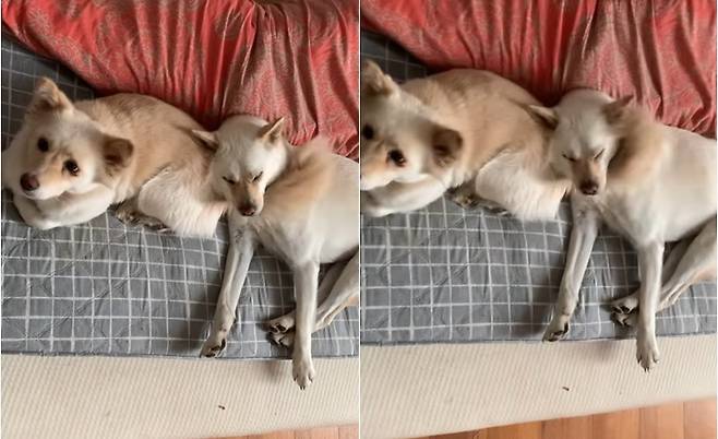 공개된 영상에는 반려견 미달이와 고실이가 서로 몸을 붙이고 쉬고 있는 모습이 담겨 있다.