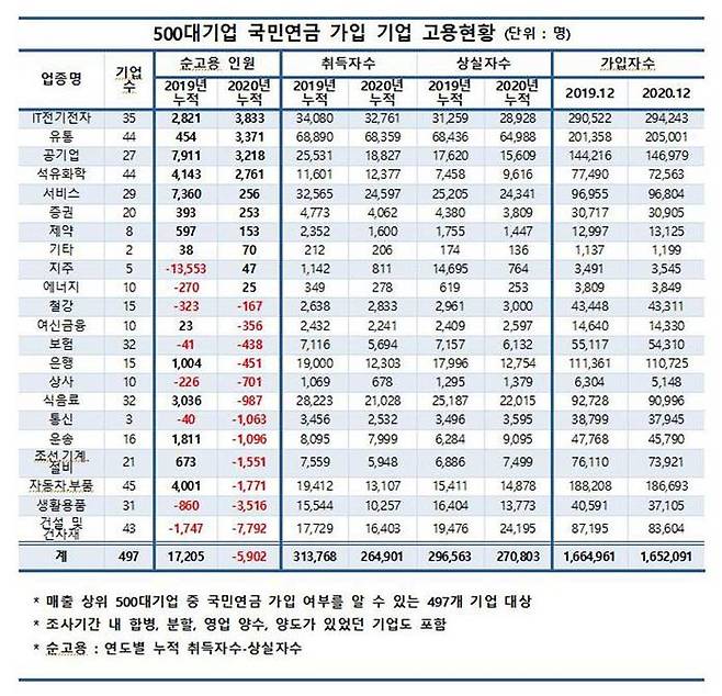 기업평가사이트 CEO스코어가 오늘(3일) 국내 500대 기업 중 497개 회사의 국민연금 가입자 현황을 조사한 결과 지난해 이들 회사의 국민연금 가입자 수는 5천902명 줄어들었습니다.